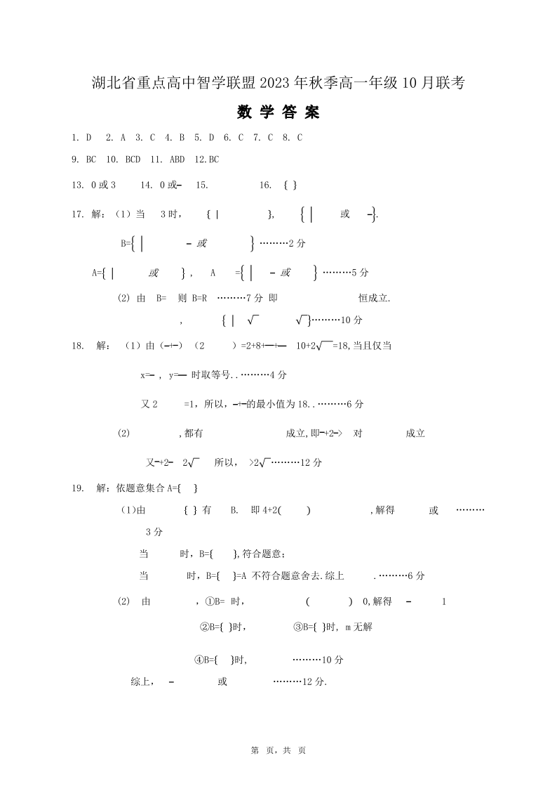 湖北省重点高中智学联盟2023年秋季高一年级10月联考数学答案