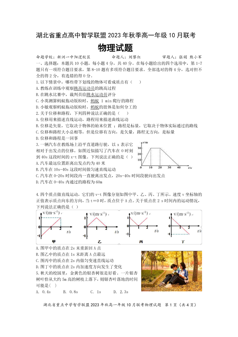 湖北省重点高中智学联盟2023年秋季高一年级10月联考物理