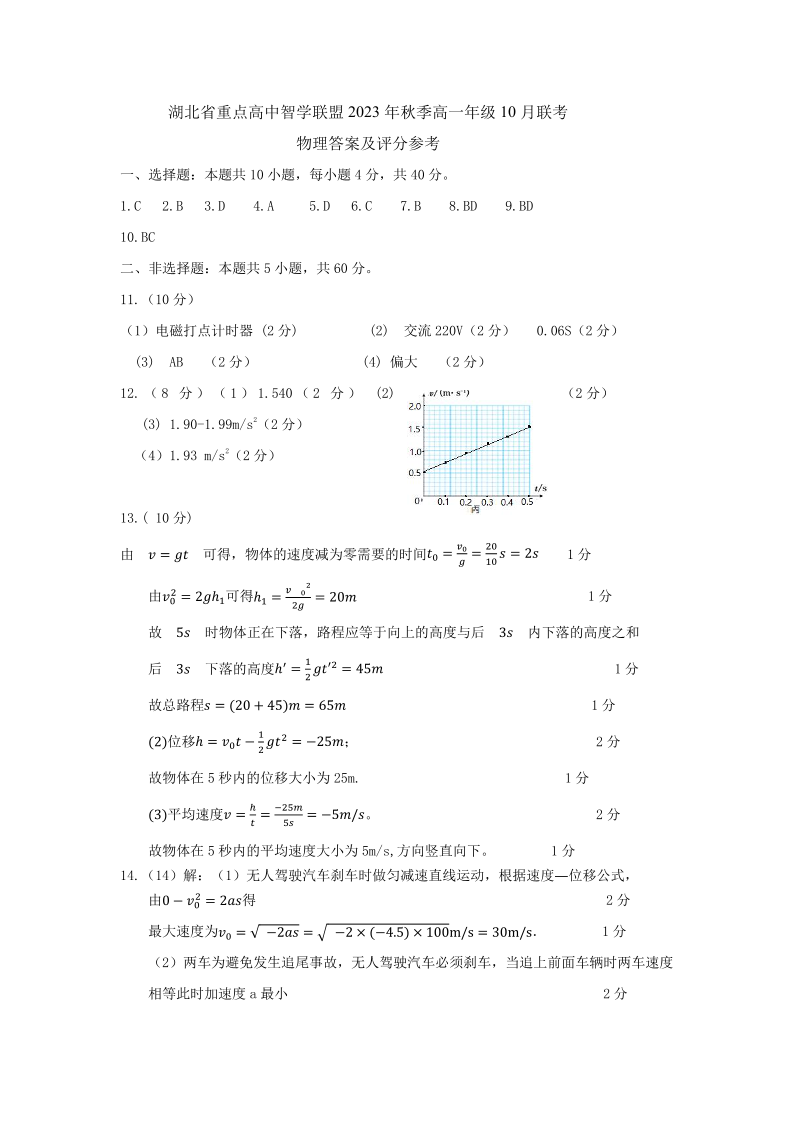 湖北省重点高中智学联盟2023年秋季高一年级10月联考物理答案