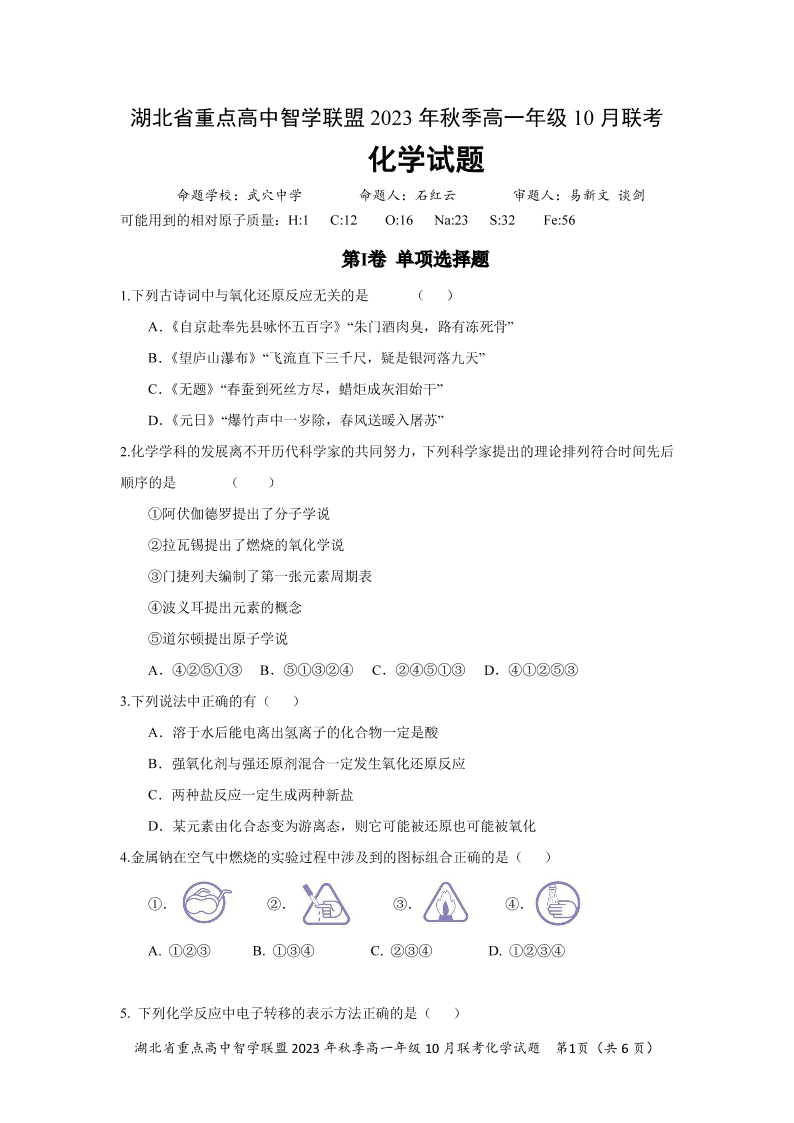 湖北省重点高中智学联盟2023年秋季高一年级10月联考化学