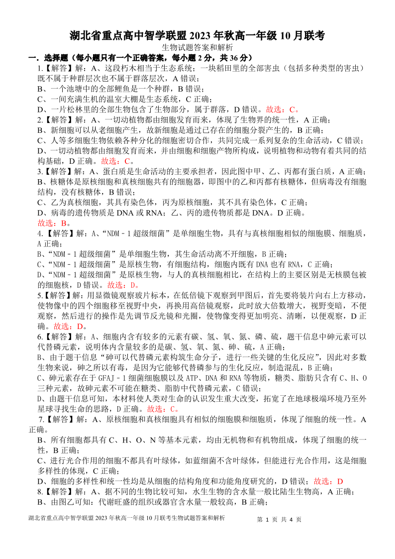 湖北省重点高中智学联盟2023年秋季高一年级10月联考生物答案