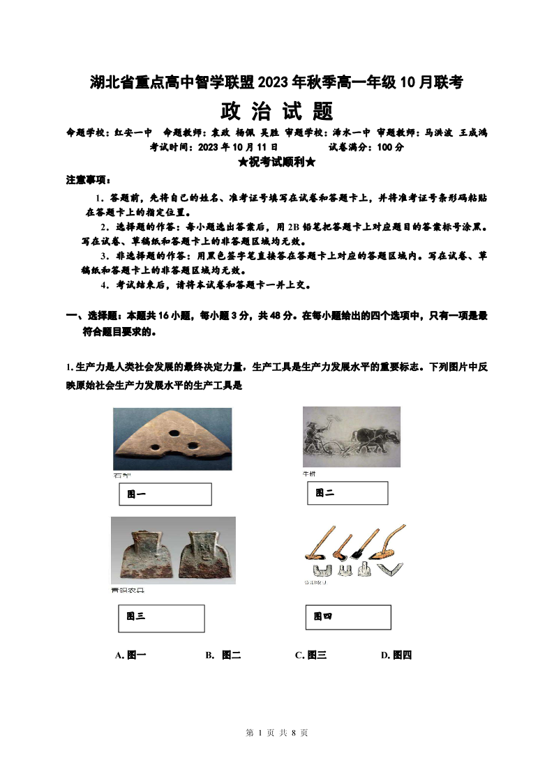 湖北省重点高中智学联盟2023年秋季高一年级10月联考政治
