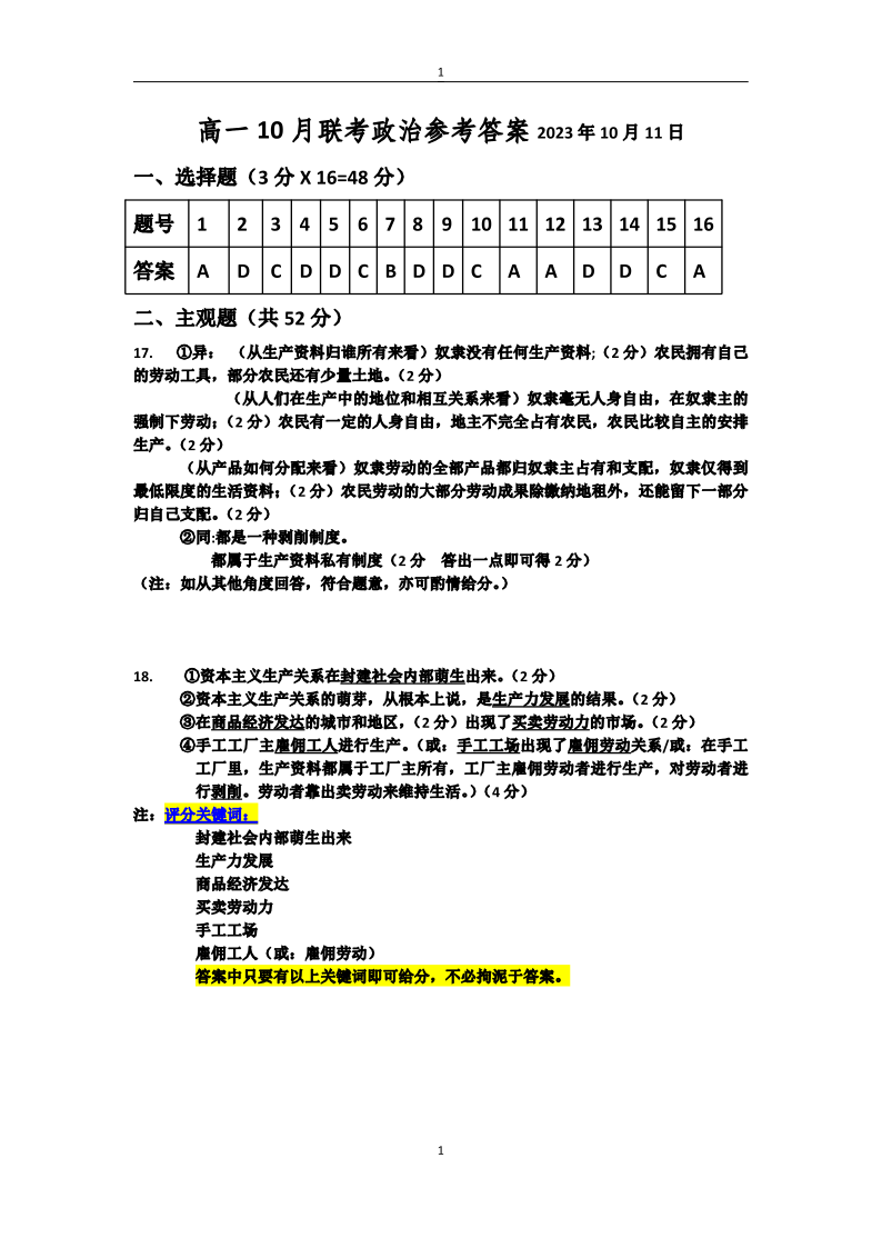 湖北省重点高中智学联盟2023年秋季高一年级10月联考政治答案