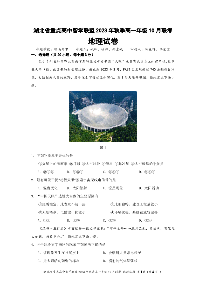 湖北省重点高中智学联盟2023年秋季高一年级10月联考地理