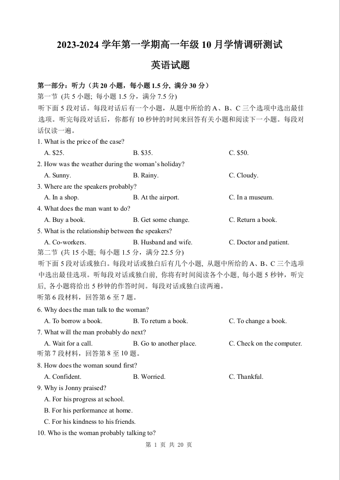 江苏省高邮市2023-2024学年高一上学期10月联考英语+答案