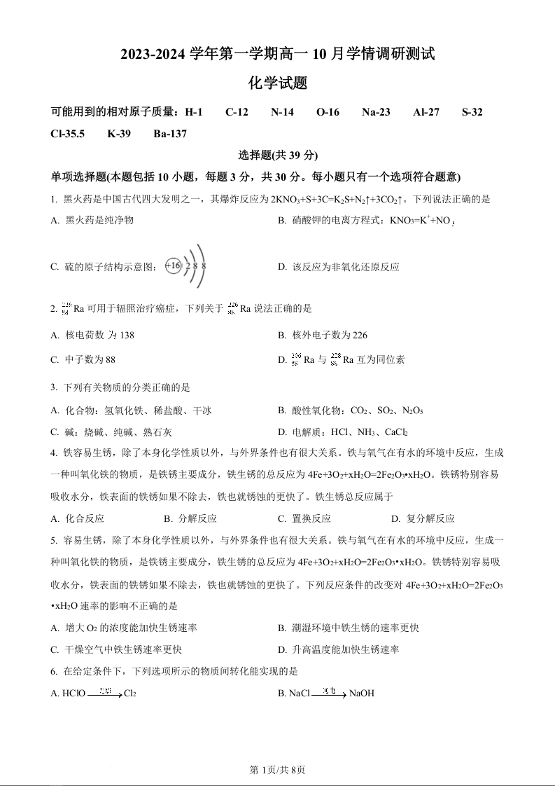 江苏省高邮市2023-2024学年高一上学期10月联考化学(原卷版)