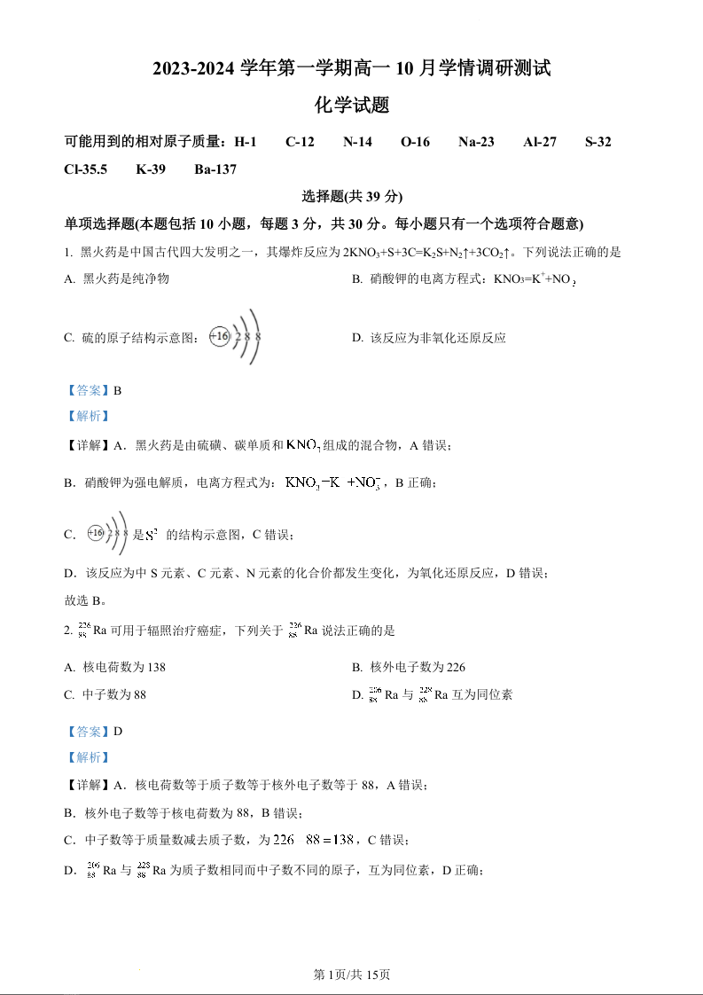 江苏省高邮市2023-2024学年高一上学期10月联考化学(精品解析版)