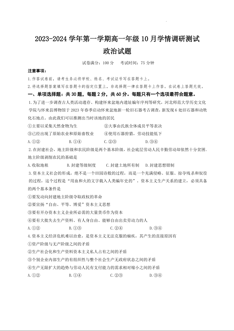 江苏省高邮市2023-2024学年高一上学期10月联考试题政治