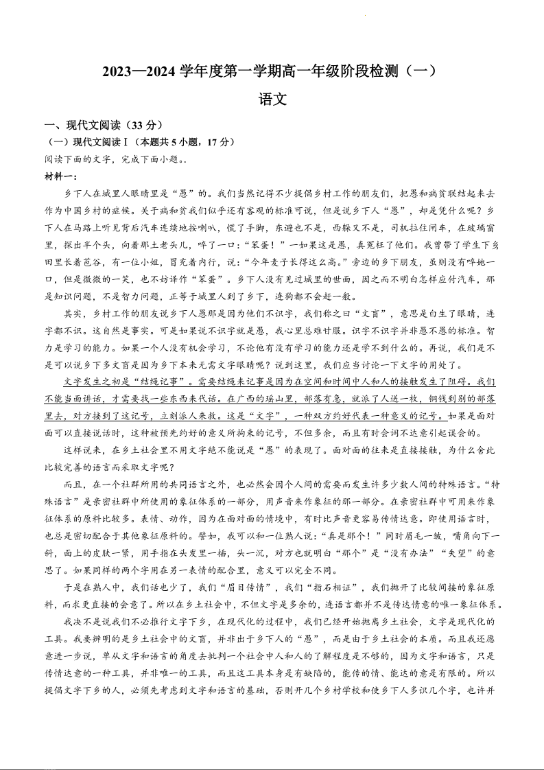 江苏省海安高级中学2023-2024学年高一上学期10月月考语文+答案