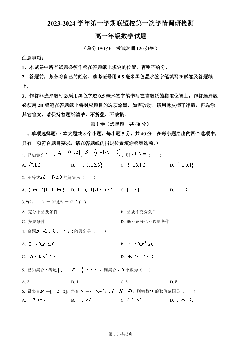 江苏省盐城市五校联考2023-2024学年高一上学期10月月考数学(原卷版)
