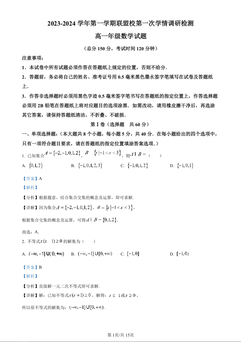 江苏省盐城市五校联考2023-2024学年高一上学期10月月考数学(精品解析版)