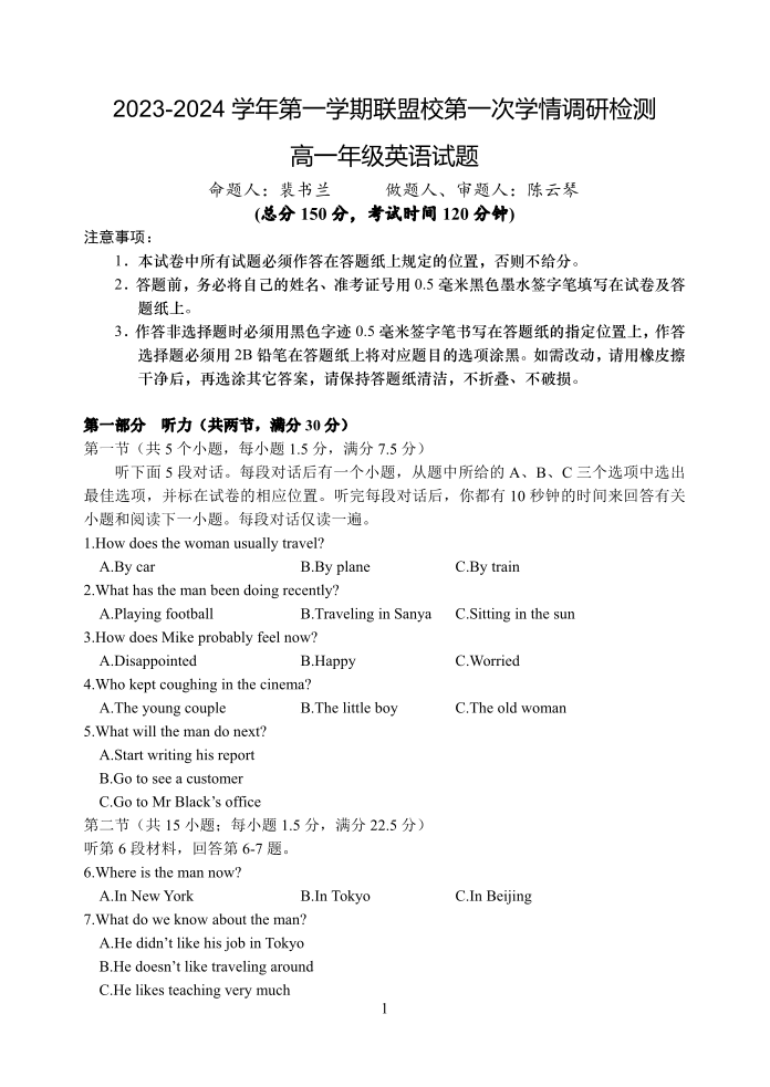 江苏省盐城市五校联考2023-2024学年高一上学期10月月考英语