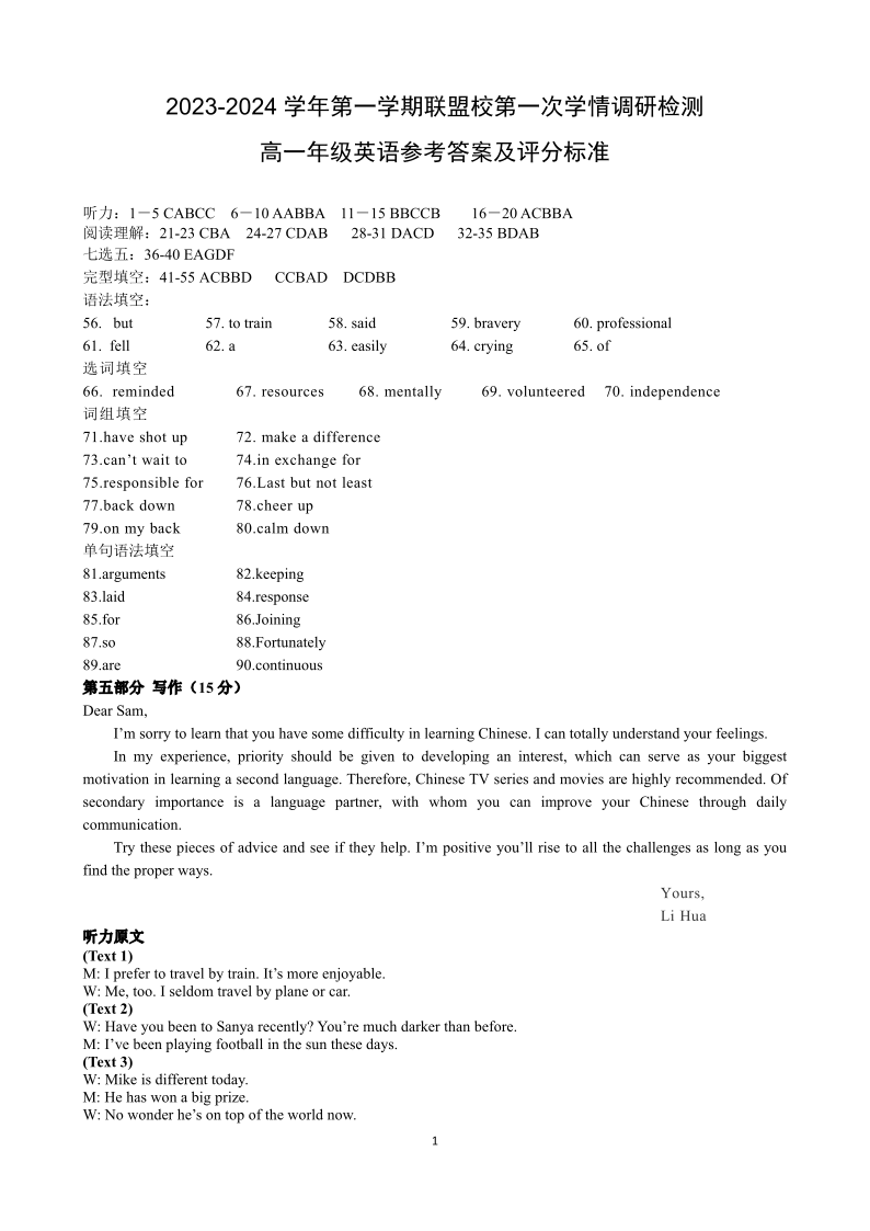 江苏省盐城市五校联考2023-2024学年高一上学期10月月考英语答案