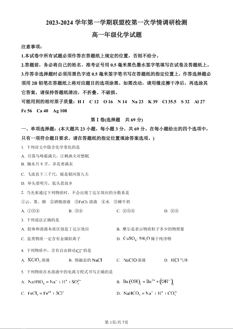 江苏省盐城市五校联考2023-2024学年高一上学期10月月考化学(原卷版)