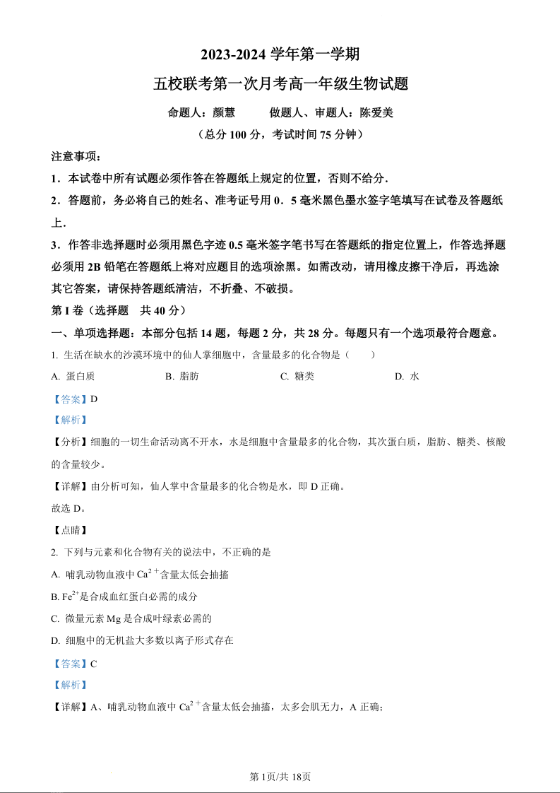江苏省盐城市五校联考2023-2024学年高一上学期10月月考生物(精品解析版)