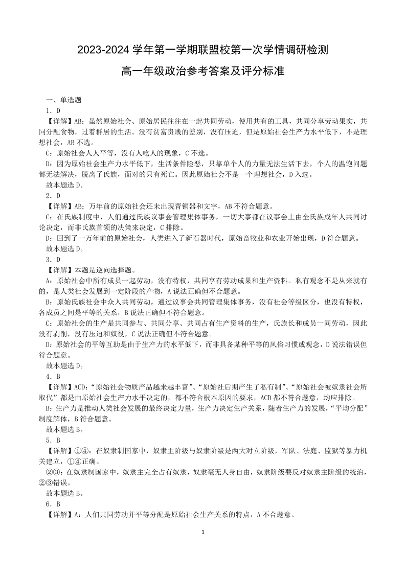 江苏省盐城市五校联考2023-2024学年高一上学期10月月考政治答案