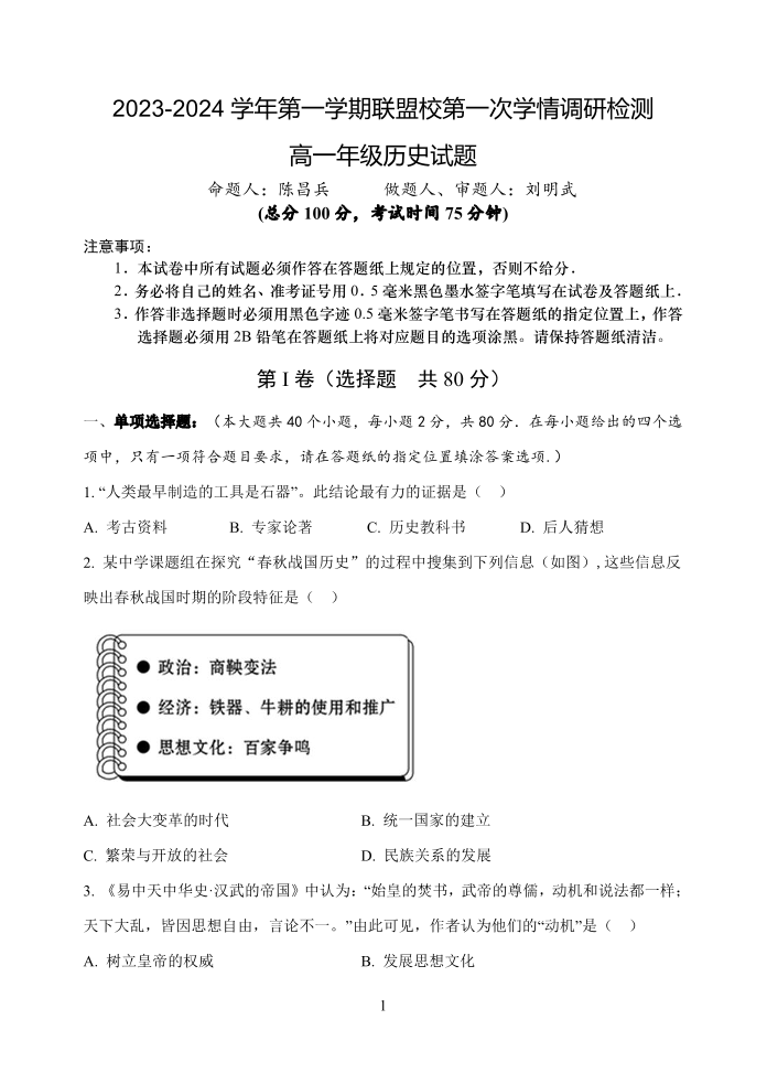 江苏省盐城市五校联考2023-2024学年高一上学期10月月考历史