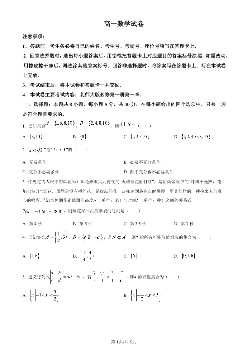 江西省部分学校2023-2024学年高一上学期10月联考数学(原卷版)
