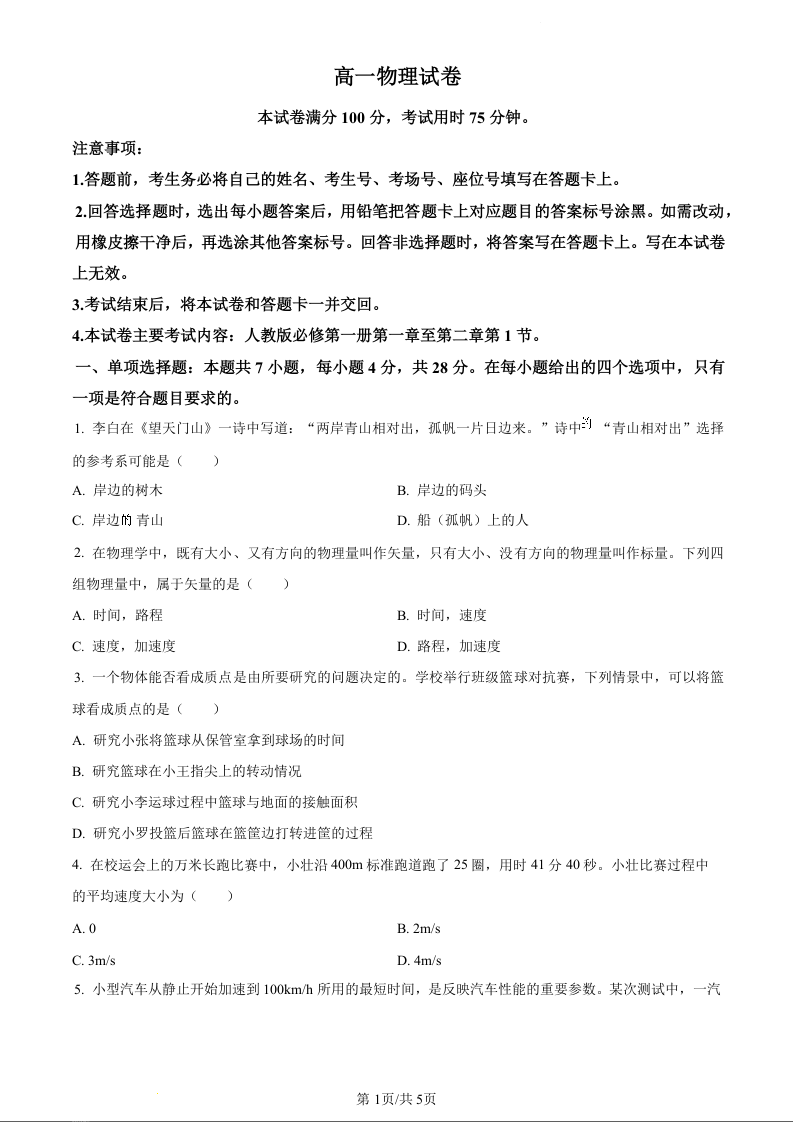 江西省部分学校2023-2024学年高一上学期10月联考物理(原卷版)