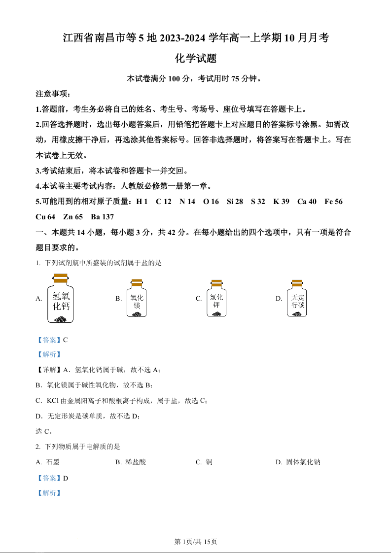 江西省部分学校2023-2024学年高一上学期10月联考化学(精品解析版)