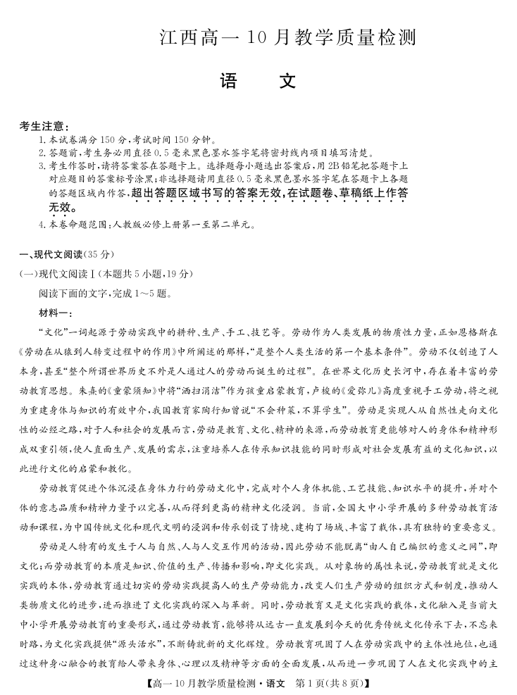 江西省名校联盟2023-2024学年高一上学期10月质量检测语文