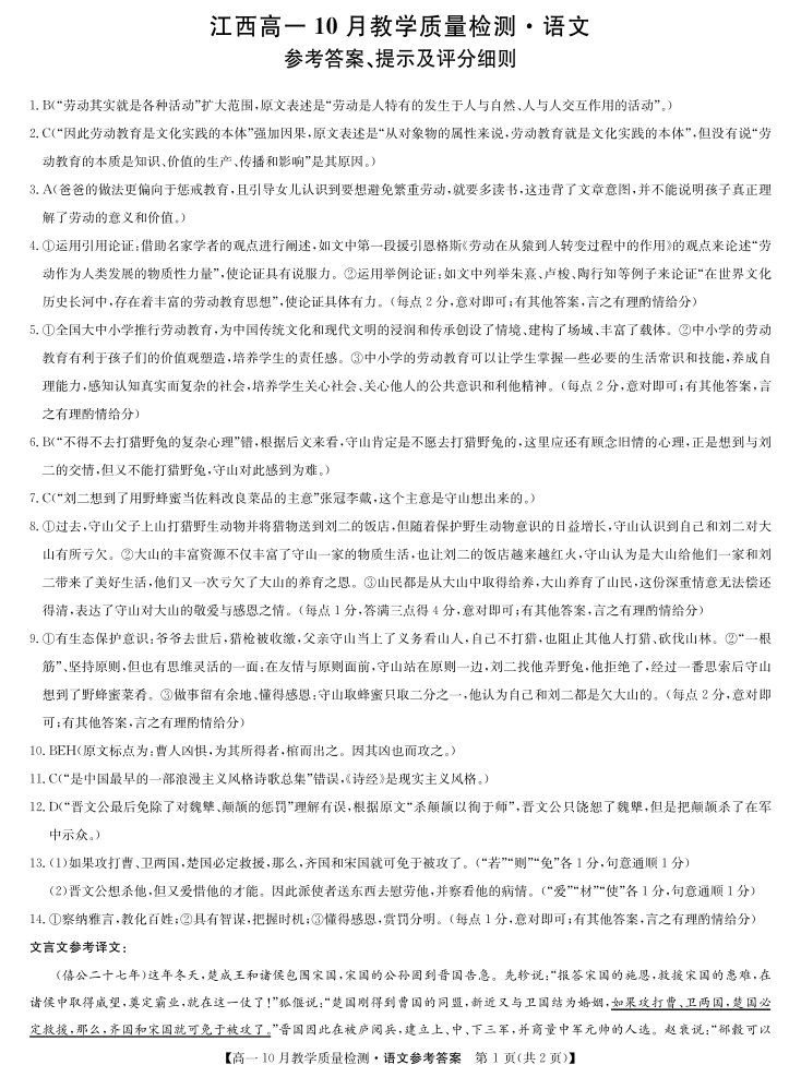 江西省名校联盟2023-2024学年高一上学期10月质量检测语文答案