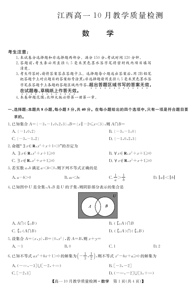 江西省名校联盟2023-2024学年高一上学期10月质量检测数学