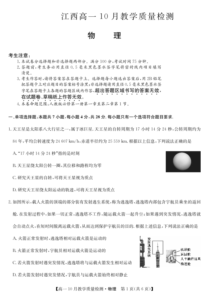江西省名校联盟2023-2024学年高一上学期10月质量检测物理