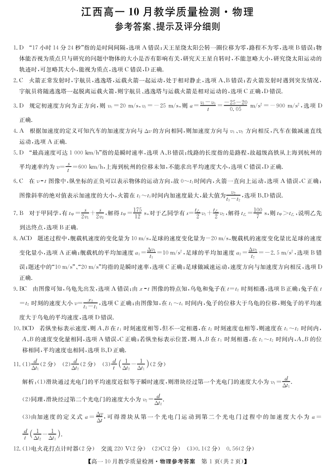 江西省名校联盟2023-2024学年高一上学期10月质量检测物理答案