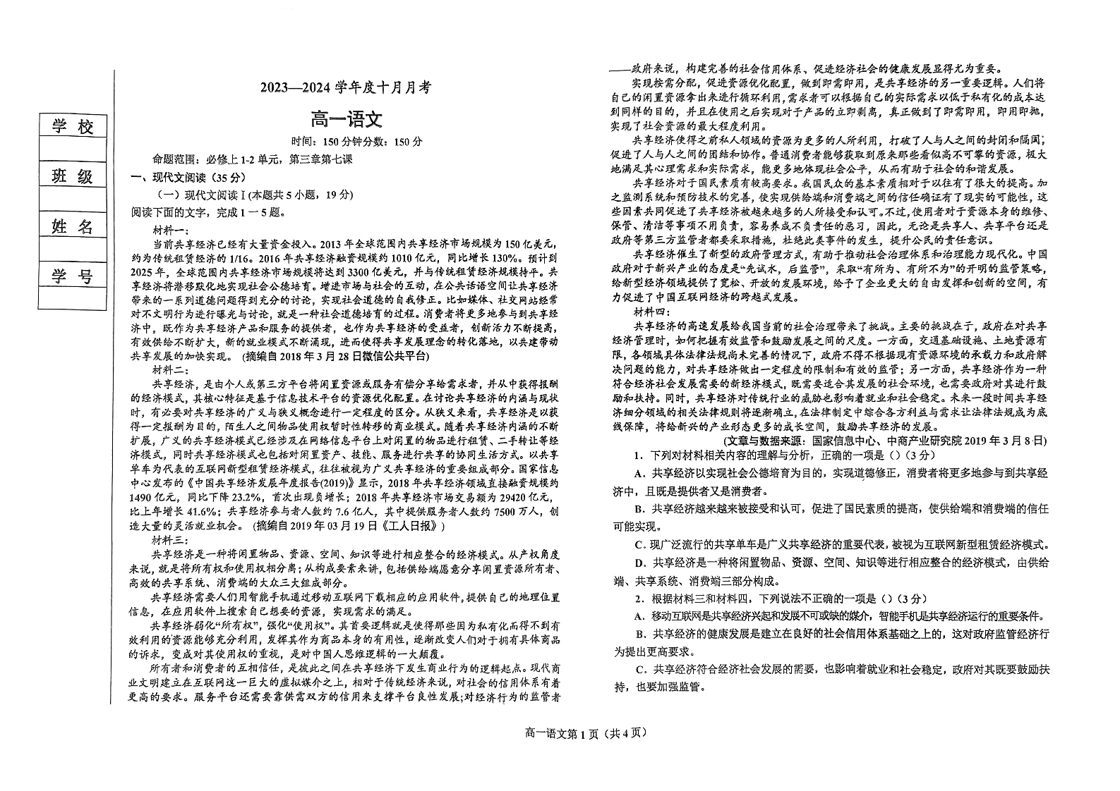 辽宁省鞍山市普通高中2023-2024学年高一上学期10月月考语文