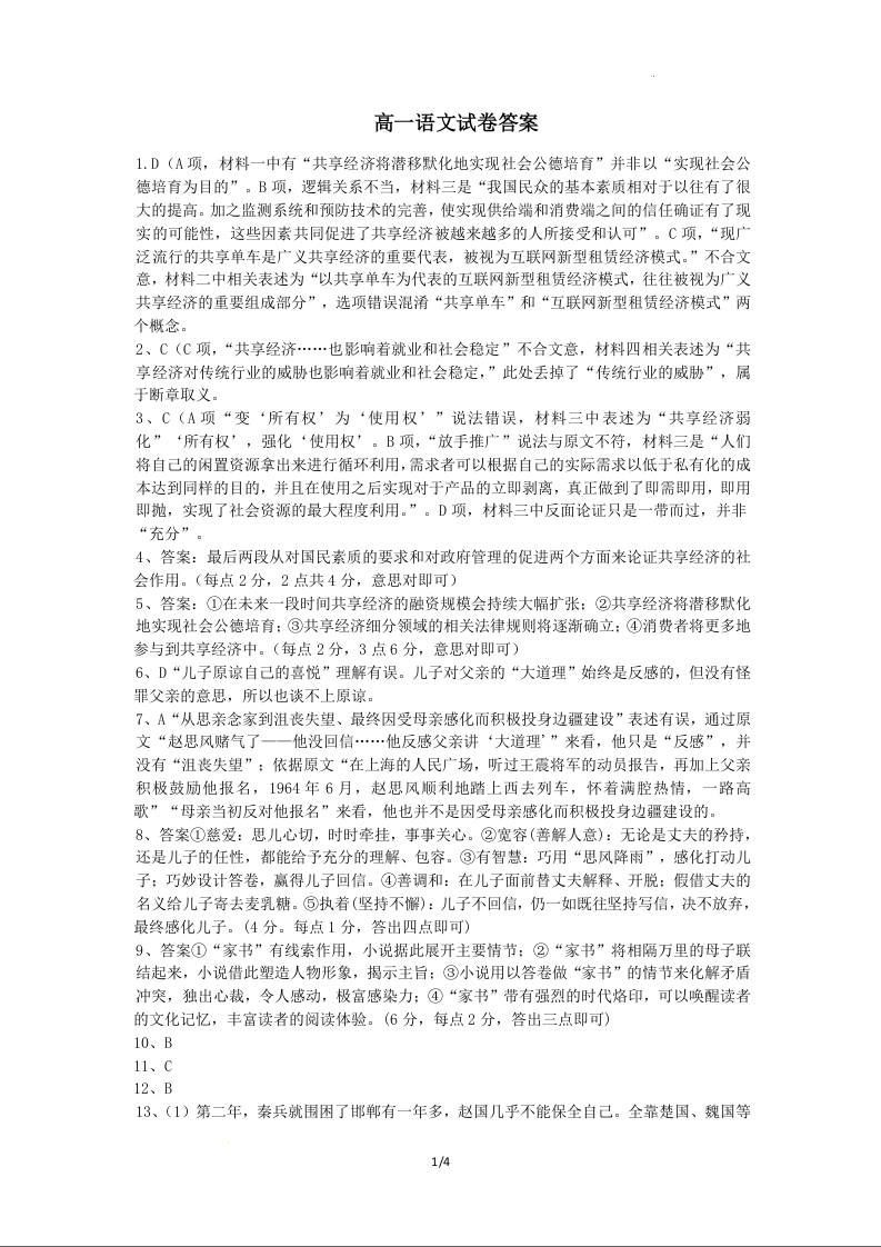 辽宁省鞍山市普通高中2023-2024学年高一上学期10月月考语文答案