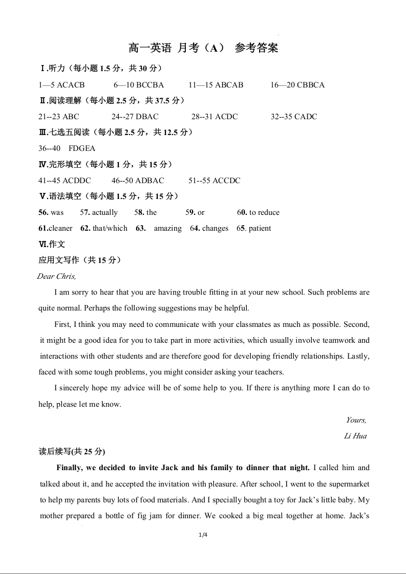 辽宁省鞍山市普通高中2023-2024学年高一上学期10月月考英语答案