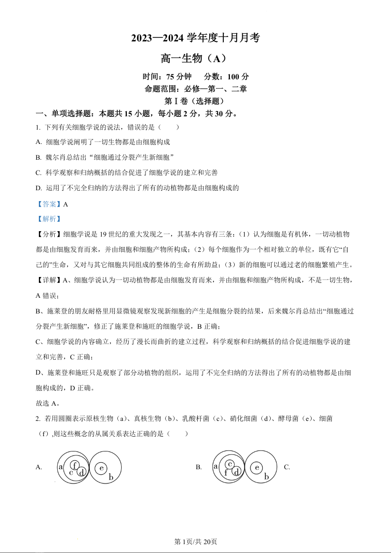 辽宁省鞍山市普通高中2023-2024学年高一上学期10月月考生物(精品解析版)