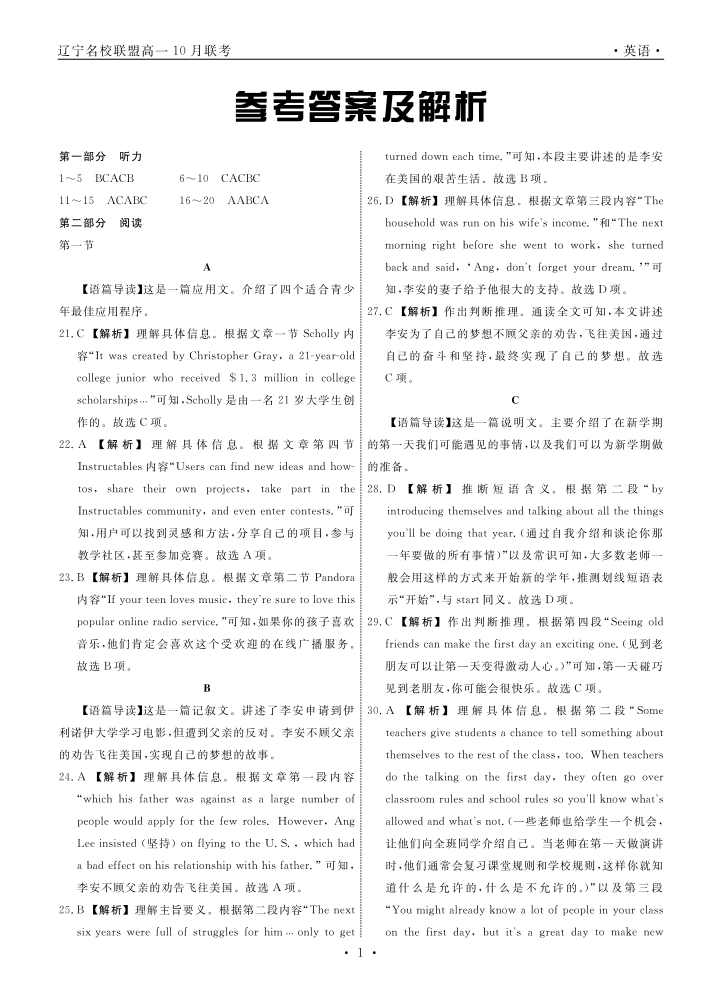 辽宁省名校联盟2023-2024学年高一上学期10月份联考英语答案