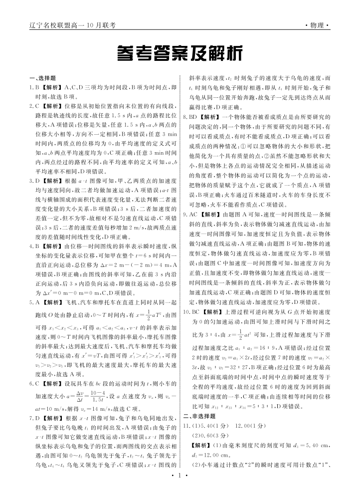 辽宁省名校联盟2023-2024学年高一上学期10月份联考物理答案