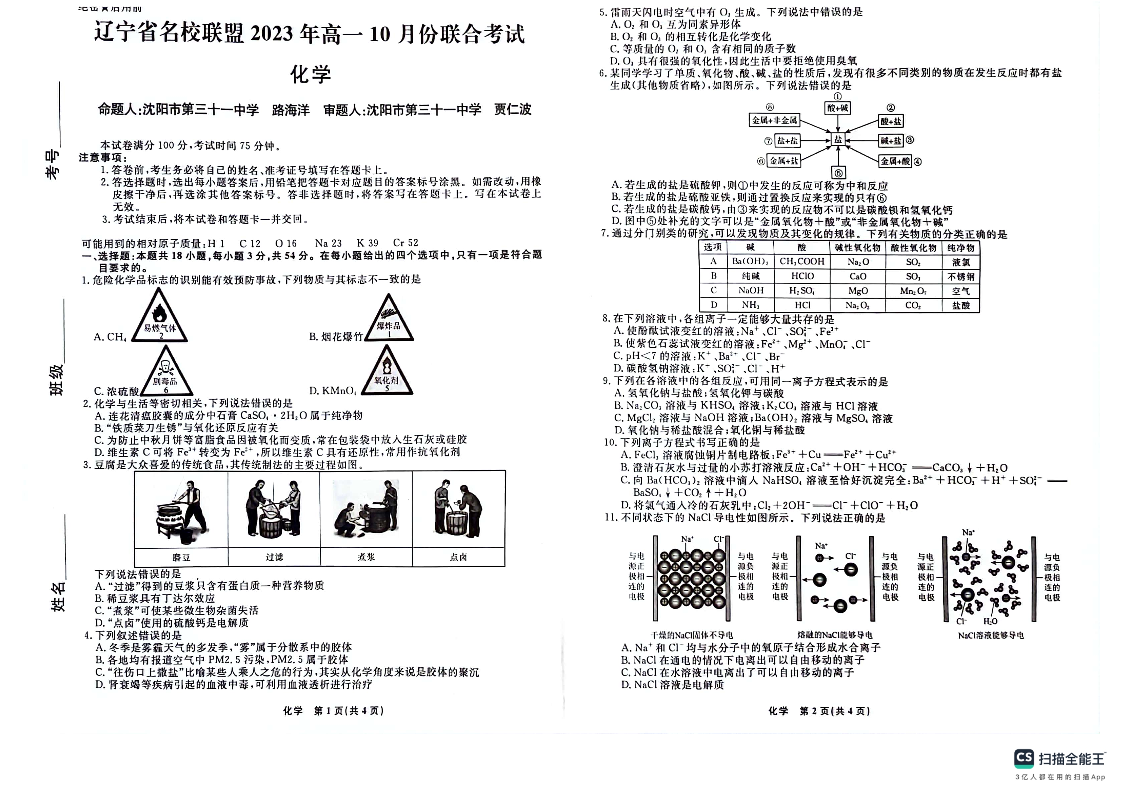 辽宁省名校联盟2023-2024学年高一上学期10月份联考化学
