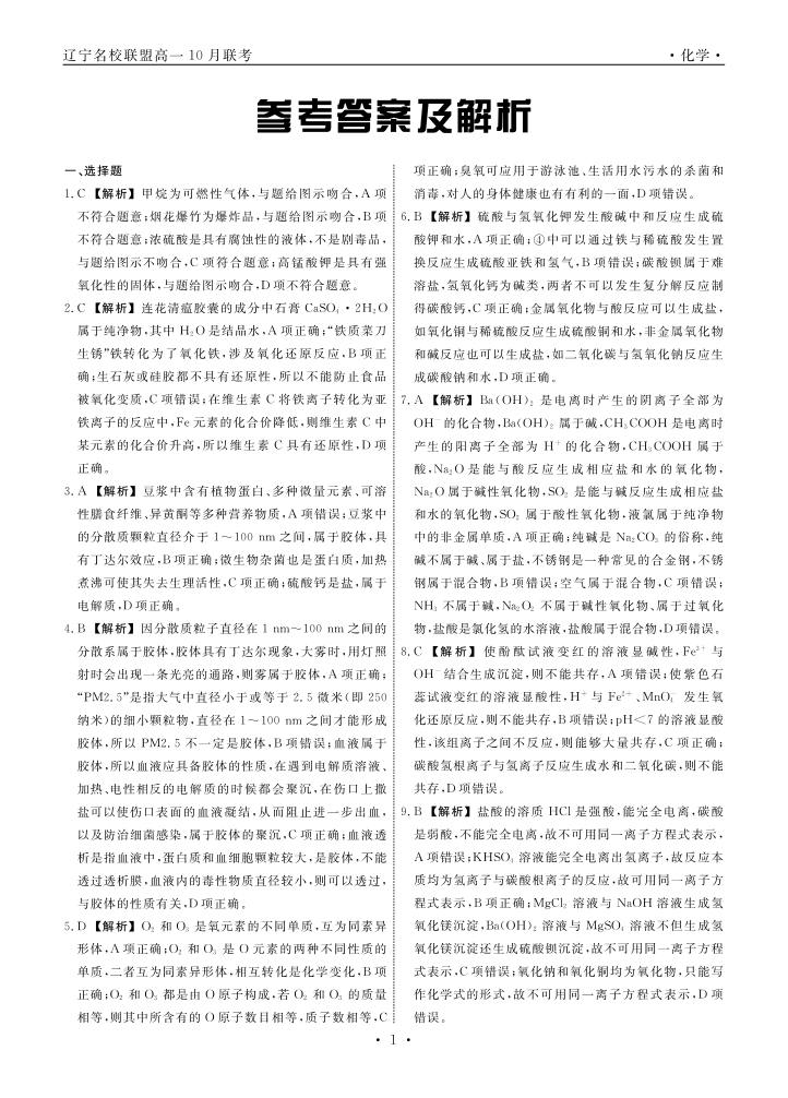 辽宁省名校联盟2023-2024学年高一上学期10月份联考化学答案