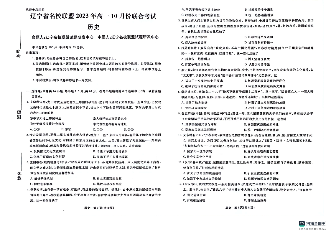 辽宁省名校联盟2023-2024学年高一上学期10月份联考历史