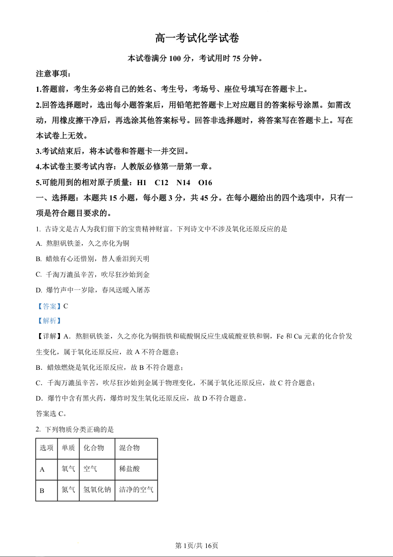 辽宁省县级重点高中联合体2023-2024学年高一上学期10月联考化学(精品解析版)