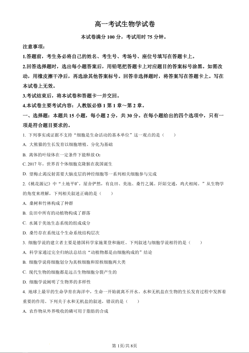 辽宁省县级重点高中联合体2023-2024学年高一上学期10月联考生物(原卷版)