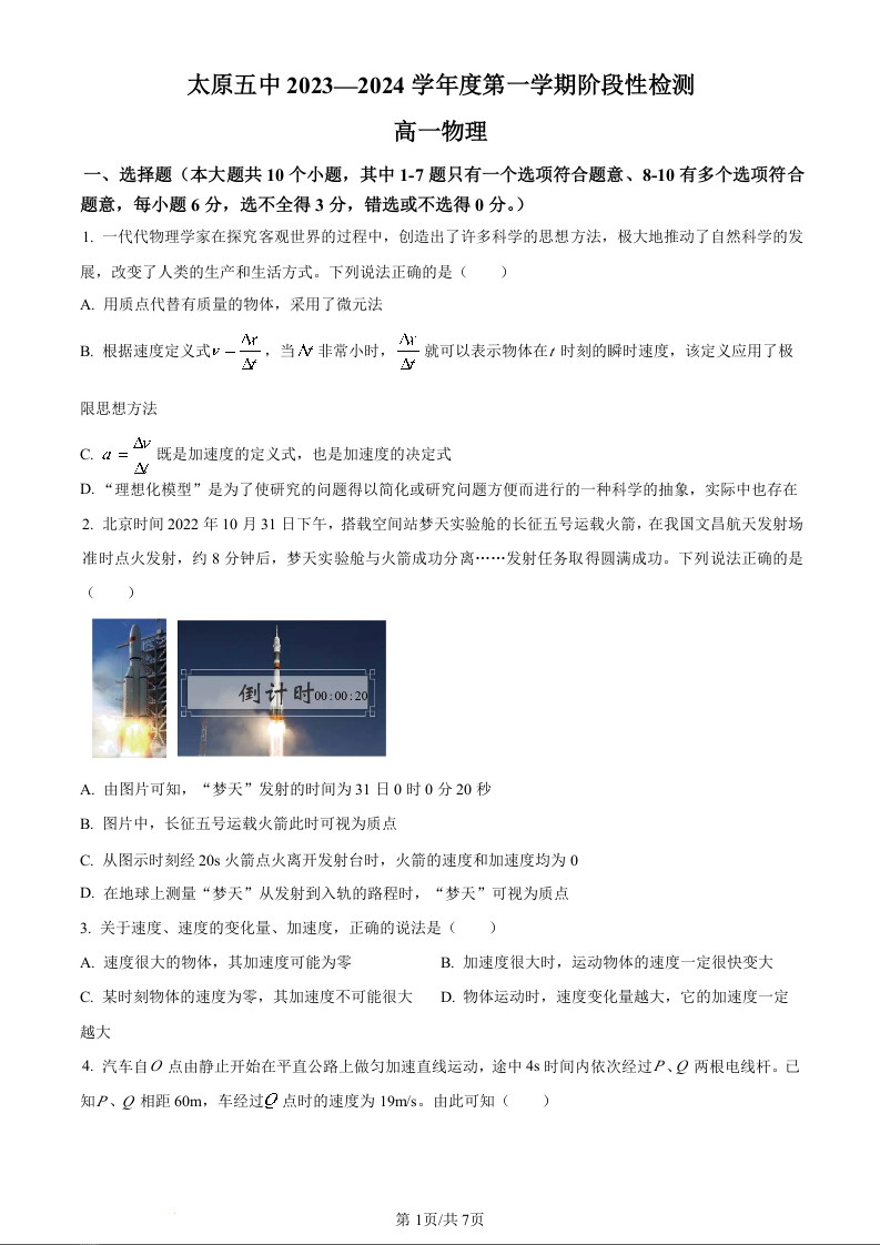 山西省太原市五中2023-2024学年高一10月月考物理(原卷版)