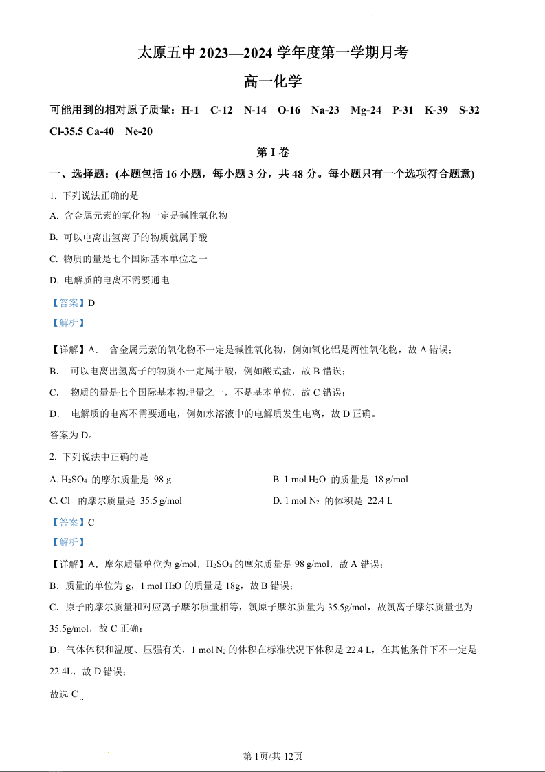 山西省太原市五中2023-2024学年高一10月月考化学(精品解析版)