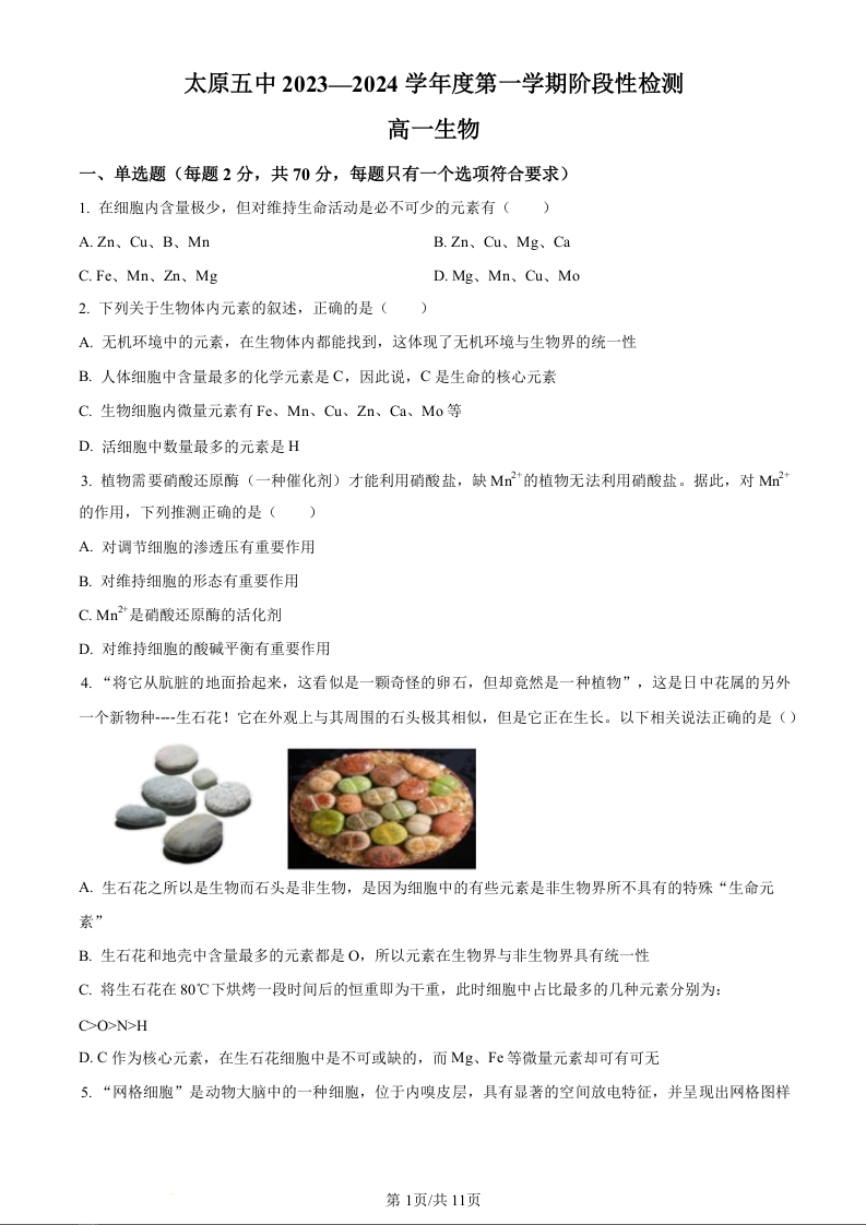山西省太原市五中2023-2024学年高一10月月考生物(原卷版)