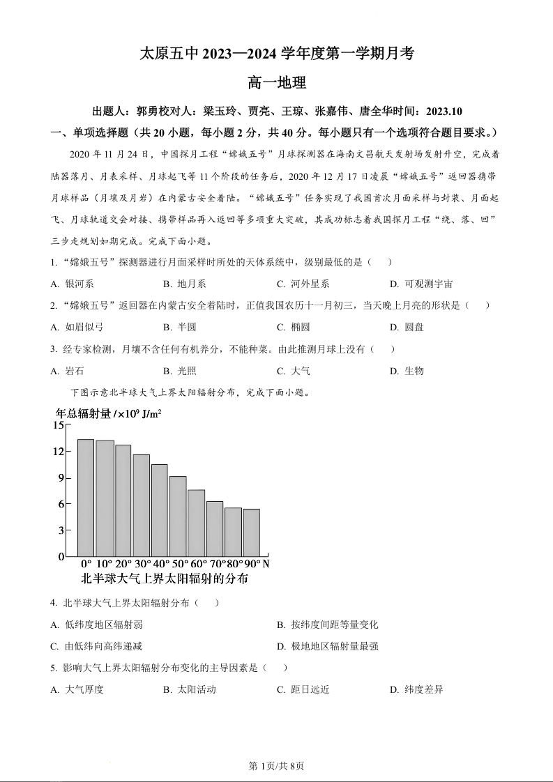 山西省太原市五中2023-2024学年高一10月月考地理(原卷版)