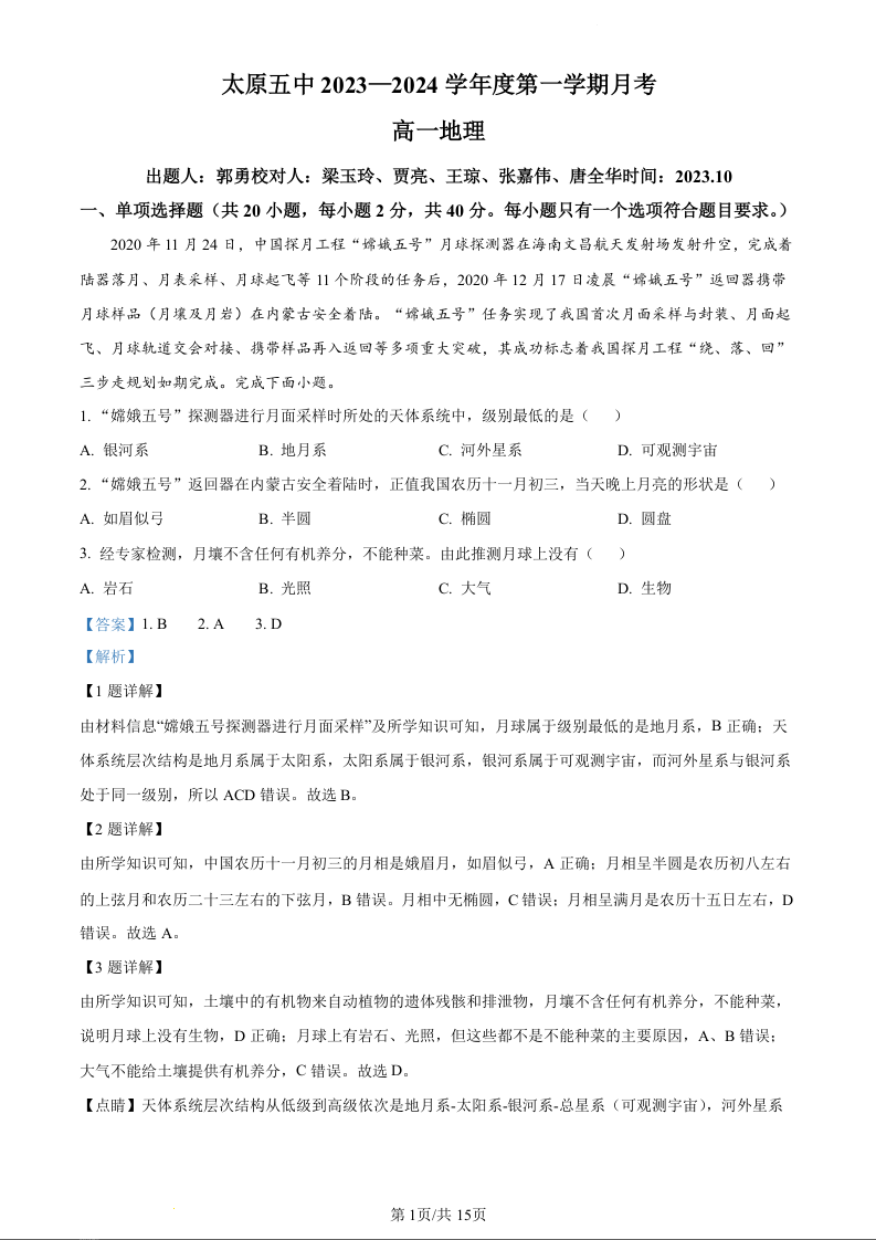 山西省太原市五中2023-2024学年高一10月月考地理(精品解析版)