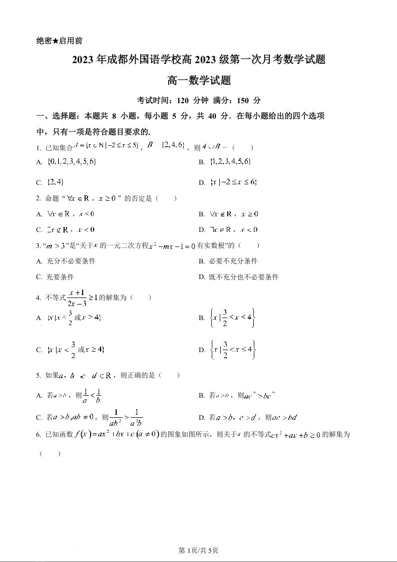 四川省成都市外国语学校2023-2024学年高一上学期10月月考数学(原卷版)
