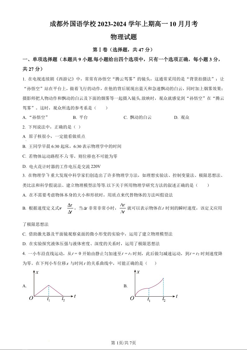 四川省成都市外国语学校2023-2024学年高一上学期10月月考物理(原卷版)