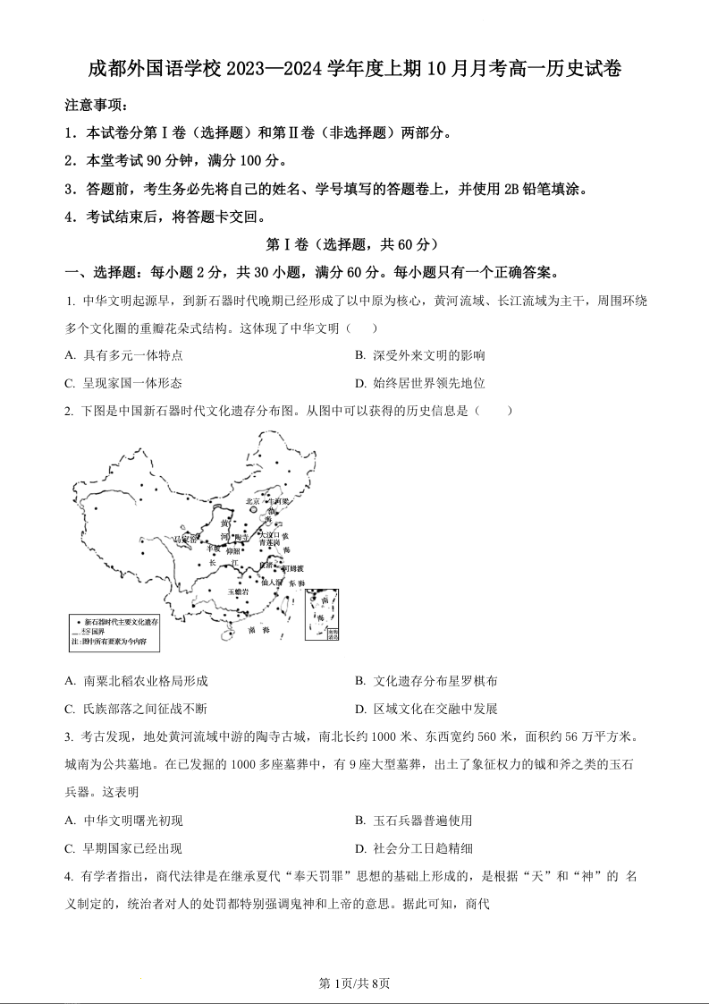 四川省成都市外国语学校2023-2024学年高一上学期10月月考历史(原卷版)
