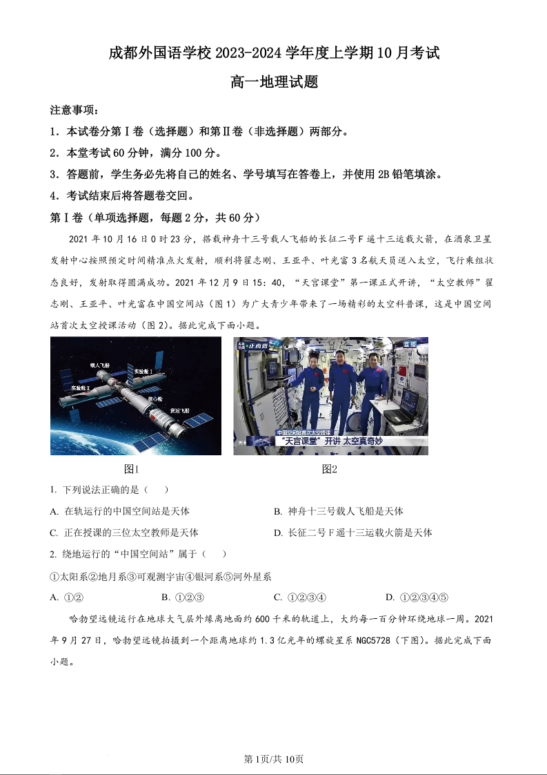 四川省成都市外国语学校2023-2024学年高一上学期10月月考地理(原卷版)