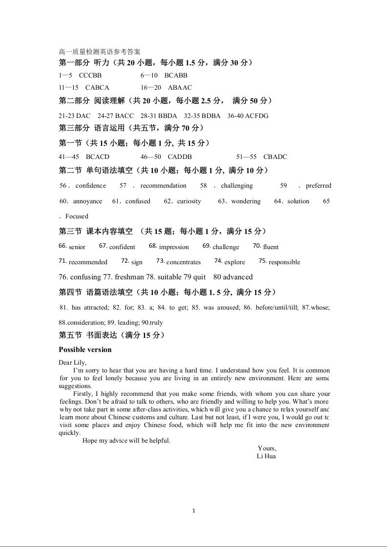 浙江省余姚中学2023-2024学年高一上学期第一次质量检测英语答案